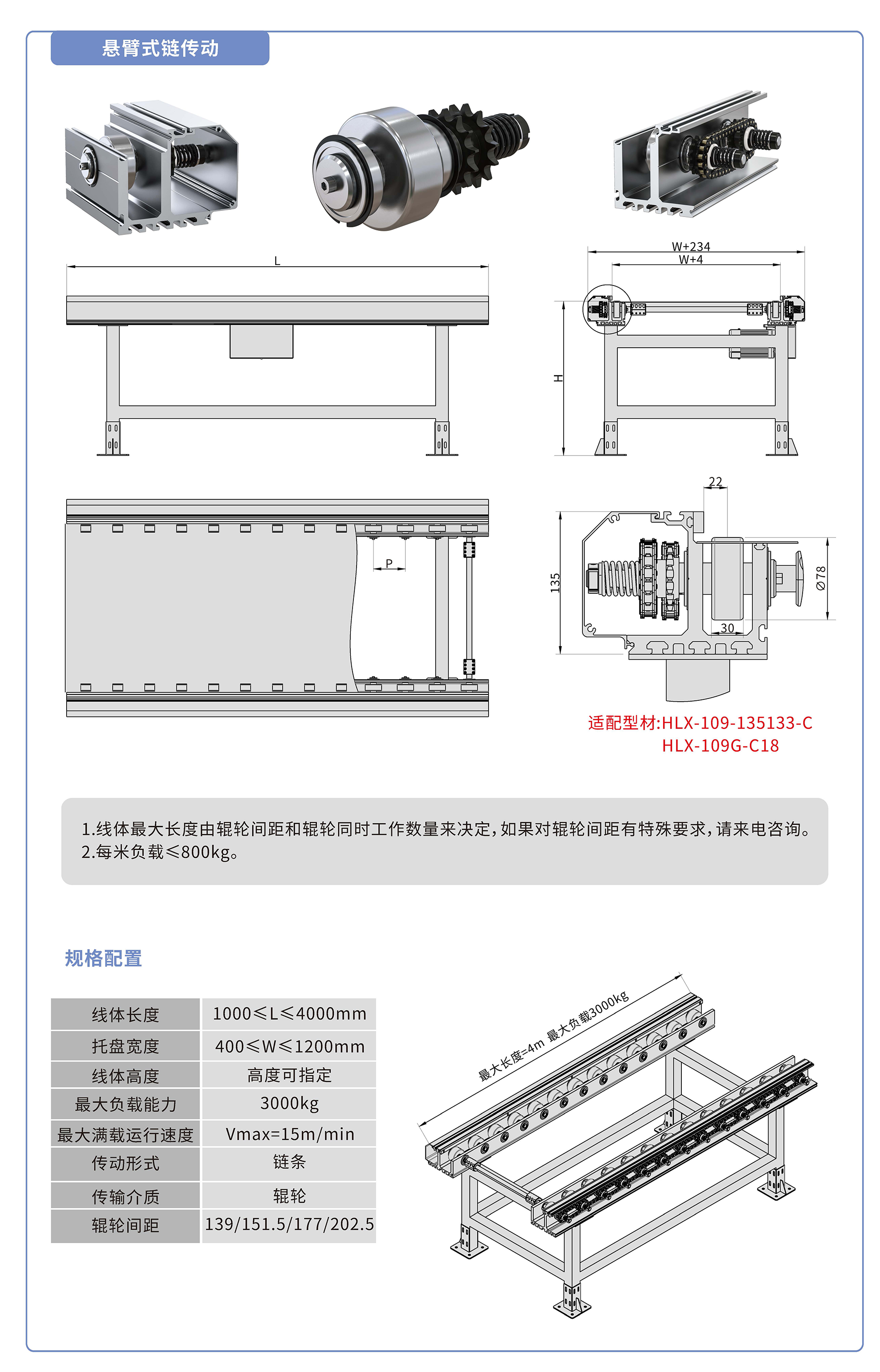采用135133鋁型材,鏈輪傳動(dòng),鍍鉻滾輪鑲嵌銅套實(shí)現(xiàn)積放功能,負(fù)載3000kg/米,最大負(fù)載速度15M/min, 輪距139、151.5、177、202.5可選,適用托盤寬度400-1200mm,線體長(zhǎng)度范圍1000-4000mm, 高度根據(jù)需求定制.