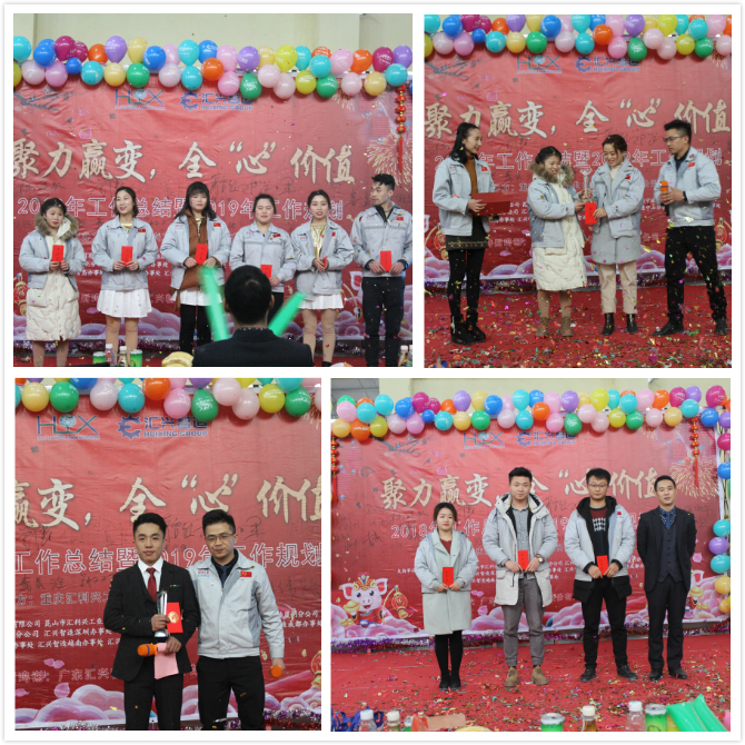 特等獎、一等獎、二等獎、三等獎 人生百味,五味最常在-品嘗人生五味象牙塔(酸、甜、苦、辣、咸),胡總攜全體家人們一起品嘗五味,一起嘗遍酸、甜、苦、辣、咸,回味2018年點點滴滴幸福的甜及幸福的苦,一起同甘苦共患難,也正是有了這五味,讓匯興生活多姿多彩。 緊接著進(jìn)入頒獎環(huán)節(jié),對2018年中所取得成績及進(jìn)步的家人分別頒發(fā)了最佳付出獎、最佳團(tuán)隊獎、最佳進(jìn)步獎、鼓勵獎,以資鼓勵。隨后胡總宣讀人事任命(任命熊學(xué)斌為銷售副總、周榮任命為物控主管、蒲曾紅任命為外省市場部負(fù)責(zé)人)。  最佳進(jìn)步、最佳團(tuán)隊、最佳付出、鼓勵獎 隨著時間的推移,年會逐步接近尾聲,全體匯興家人合唱匯利興之歌《相信我們會創(chuàng)造奇跡》,會議就隨著家人們的歌聲而告一段落,但匯興人追夢的腳步卻一直在前進(jìn)。夢想是豐滿的,未來更值得期待,2019年匯興人將用行動詮釋“聚力贏變,全心價值”,加油!