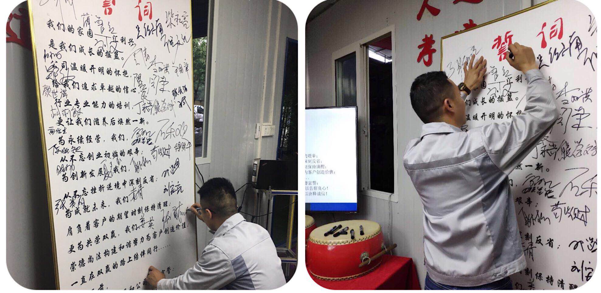 會議第二項議程,企業(yè)文化的展示。全體匯興人整肅衣冠對匯興人倍加推崇的“三道文化”(孝道、商道、人道)鄭重地鞠躬,莊嚴(yán)宣誓企業(yè)愿景:“成為全球領(lǐng)先的智能自動化產(chǎn)業(yè)鏈集成服務(wù)商”,企業(yè)使命:做受尊敬的好人,造受尊敬的產(chǎn)品,辦受尊敬的企業(yè),建受尊敬的平臺,企業(yè)精神“用情做人、用心做事”,團(tuán)隊精神“忠誠團(tuán)結(jié)、勤奮進(jìn)取”,工匠精神:創(chuàng)于手、精于工、智于器、匠于心、品于行,行為準(zhǔn)則:口中有德、目中有人、手中有技、心中有愛、行中有善,職業(yè)準(zhǔn)則:對工作熱臉、對同事笑臉、對錯誤紅臉、對浪費(fèi)黑臉、對榮譽(yù)爭臉。隨后二位核心精英擊士氣鼓,士氣比武器更重要,現(xiàn)場氣氛熱烈、振奮人心。