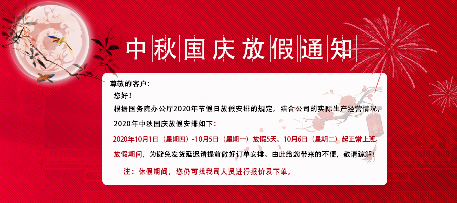 尊敬的客戶: 您好! 根據(jù)國(guó)務(wù)院辦公廳2020年節(jié)假日放假安排的規(guī)定,結(jié)合公司的實(shí)際生產(chǎn)經(jīng)營(yíng)情況,2020年中秋國(guó)慶放假安排如下: 2020年10月1日(星期四)-10月5日(星期一)放假5天。10月6日(星期二)起正常上班。 放假期間,為避免發(fā)貨延遲請(qǐng)?zhí)崆白龊糜唵伟才?。由此給您帶來的不便,敬請(qǐng)諒解!