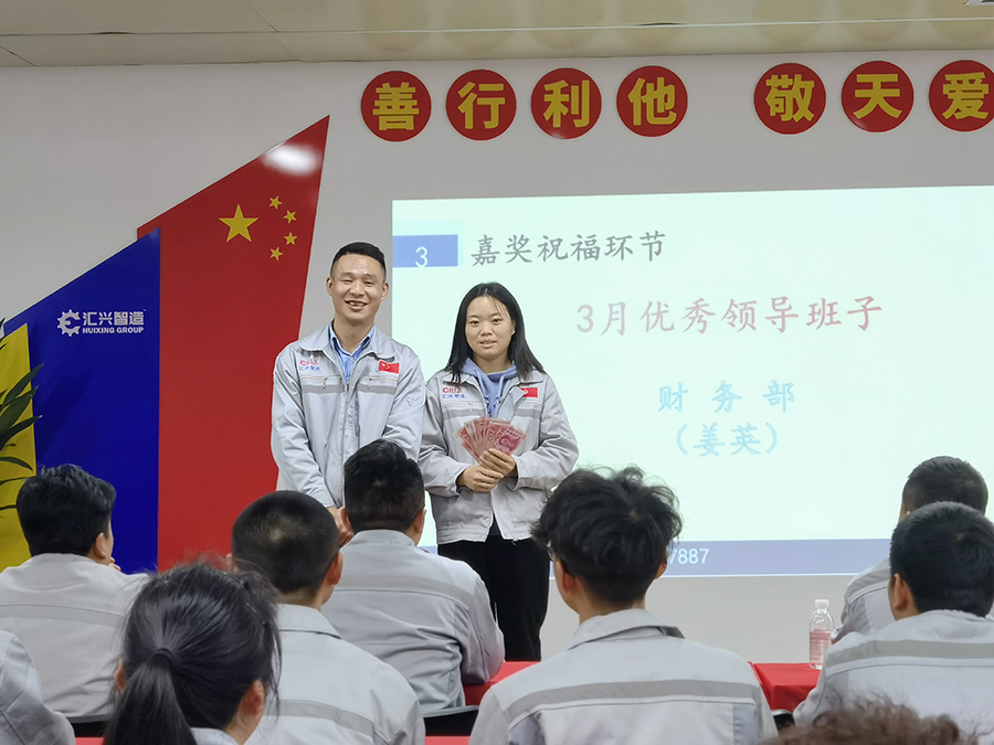 業(yè)精于勤,荒于嬉,行成于思,毀于隨??偨Y(jié)上個月工作情況,統(tǒng)籌下一個月工作計劃。匯利興西南工廠于4月9日18點40分,在匯利興學(xué)校召開三月月度會議。銷售主管劉文主持,匯利興西南工廠全體職員參會。會議開始,兩位高管敲響士氣鼓,敲響我們出征的號角,前進的戰(zhàn)鼓,鼓舞著每位員工沖鋒打勝仗的決心和毅力。全體員工向企業(yè)三道孝道、商道、人道鄭重鞠躬,宣讀企業(yè)文化,并對本月新入員工進行歡迎儀式。 春天是播種的季節(jié),同時也是催人奮進的季節(jié)。為了表彰在三月份表現(xiàn)突出的優(yōu)秀個人、優(yōu)秀主管、優(yōu)秀部門,充分發(fā)揮引領(lǐng)示范作用,最大限度調(diào)動和激發(fā)員工向優(yōu)秀人員看齊、不斷提高工作的積極性和創(chuàng)造性。本次榮獲優(yōu)秀員工(曾濤、邵靜、鄧筵暉)、優(yōu)秀主管(姜英)、優(yōu)秀部門(綜合部)。自成立以來,公司大力宣導(dǎo)我來干、努力干、拼命干的工作作風(fēng),積極鼓勵無私奉獻、恪盡職守的三好匯興人,并堅持打造一支有愛、有力量、有活力的團隊。