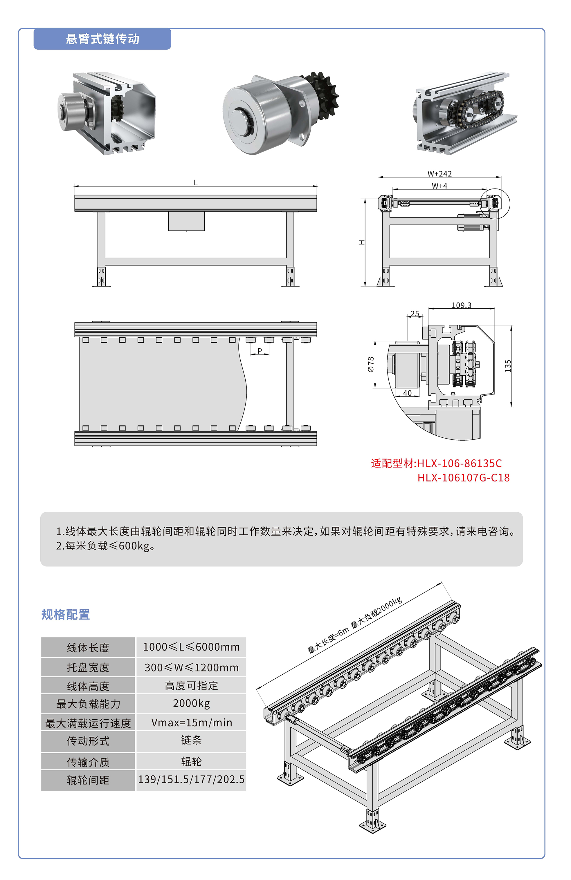 懸臂式鏈傳動:采用86135鋁型材,鏈輪傳動,鍍鉻滾輪鑲嵌銅套實現(xiàn)積放功能,負(fù)載2000kg/米,最大負(fù)載速度15M/min, 輪距139、151.5、177、202.5可選,適用托盤寬度300-1200mm,線體長度范圍1000-6000mm, 高度根據(jù)需求定制