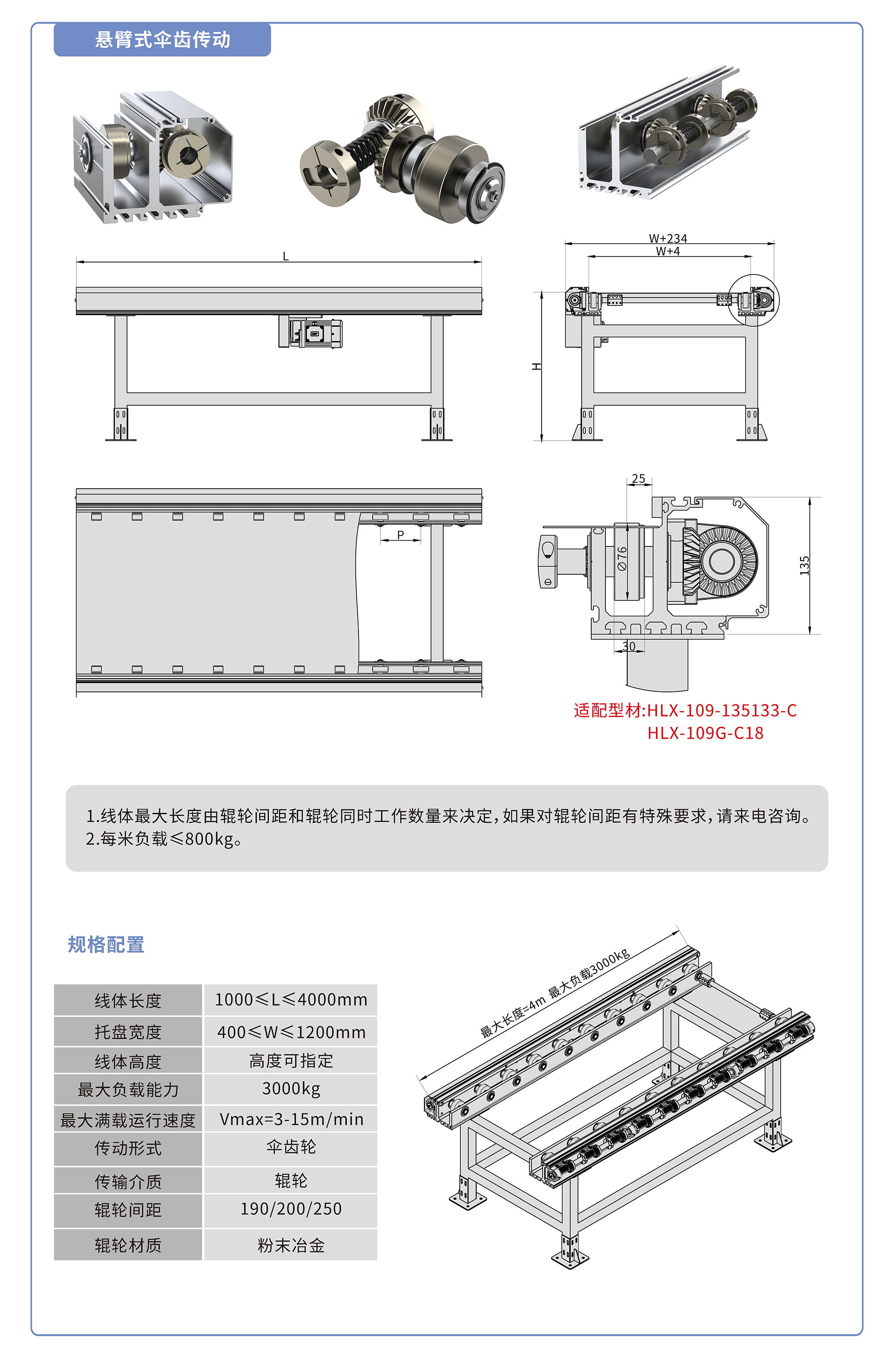 適配135133鋁型材,采用傘齒驅(qū)動,鍍鉻滾輪鑲嵌銅套實現(xiàn)積放功能,負(fù)載3000kg/米,最大負(fù)載速度15M/min, 輪距190、200、250可選,適用托盤寬度400-1200mm,線體長度范圍1000-4000mm, 高度根據(jù)需求定制.